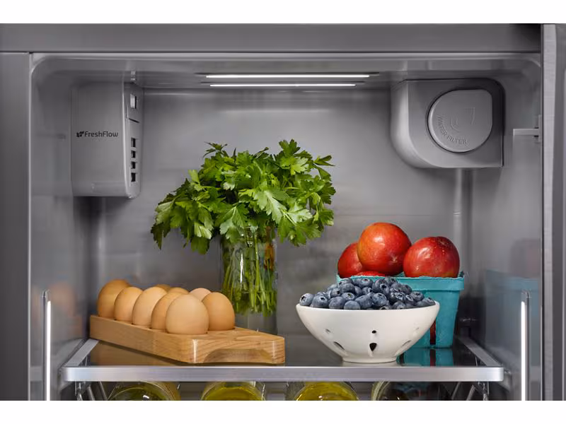 This Built-In Side-by-Side Refrigerator enhances your space with elevated styles and option to upgrade with customizable hardware. Multiple Installation Options allow you to choose the installation style that fits your aesthetic: flush for a seamless look, overlay for a softly striking incorporated look or proud for a standout presence. Signature Platinum Interior wows with wood-look trim and metallic accents, while the Under-Shelf Prep Zone utilizes unused space with included baking pan and two loaf pans, designed to go directly from the refrigerator to the oven to the dishwasher.