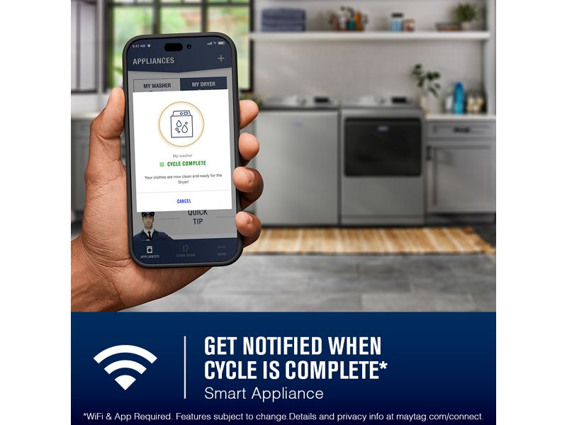 Stay on top of laundry with smartphone alerts from the Maytag™ App.* End of cycle notifications ensure finished loads aren’t left behind*WiFi & App Required. Features subject to change. Details and privacy info at maytag.ca/connect.