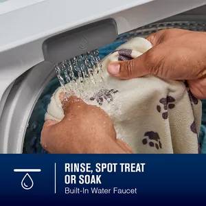 The built-in water faucet rinses, spot treats or soaks clothes right in the washer—no extra steps needed. After three hours, the water drains, leaving clothes ready for the wash cycle.