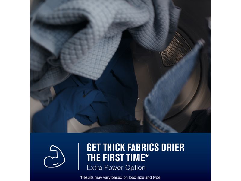 Extra Power option boosts drying power to get thick fabrics drier the first time.**Results may vary based on load size and type.
