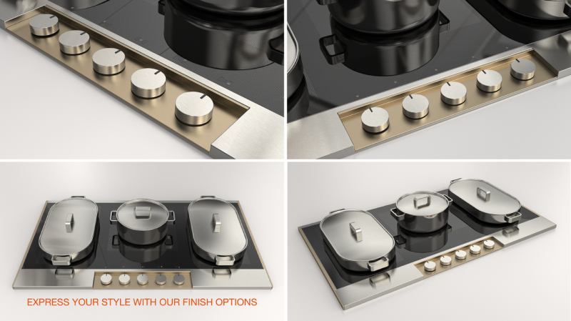 The Enova 700 series 36" Customizable Satin Aluminum Cooktop has a unique design incorporating elegant tactile knobs recessed into a 5/8" thick metal frame with removable and interchangeable control panel insert and side profiles. These profiles are available in matte black, brushed brass, or satin aluminum finishes are included. The cook top features our Quantum induction for unsurpassed power and efficiency. Each cooktop has 5 cooking zones controlled via an elegant electronic knob, with one 11" max power zone plus 2 bridge zones, each zone featuring, warm, warm plus, 1-9 levels, with boost and auto functions. The Enova cook top has all the functionality and performance you would expect from an ultra premium appliance in an exclusive and customizable design.