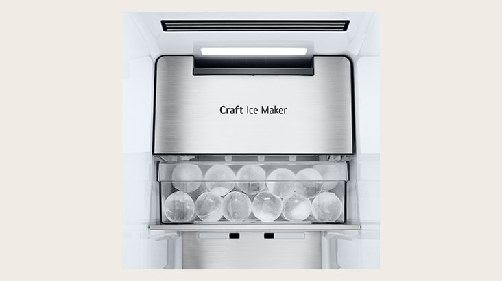 LG's dual ice maker produces slow-melting round Craft Ice(R) with ThinQ® App can activate Craft Ice+ for more ice, faster.