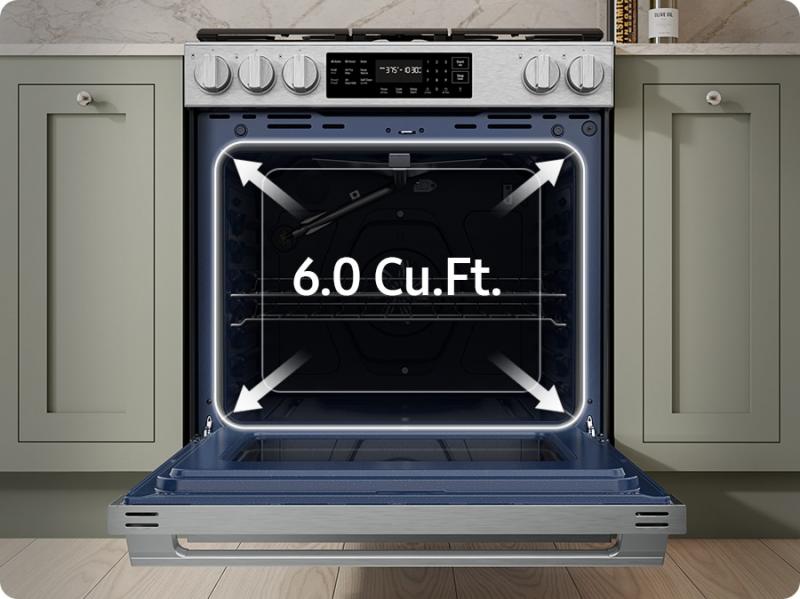 Accommodates large cookware and family-sized meals with a huge 6.0 cu. ft. capacity oven, making it perfect for everyday dinners or entertaining guests. Prepare multiple dishes at once or easily cook large items like a big roast or holiday turkey.